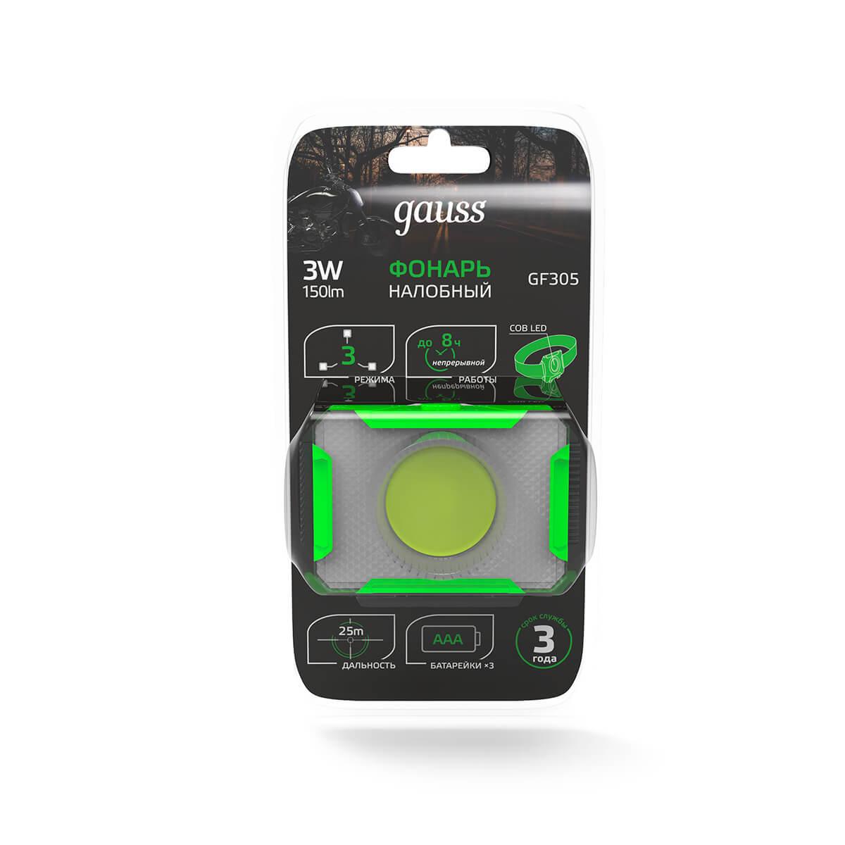 Налобный светодиодный фонарь Gauss от батареек 65х45 150 лм GF305